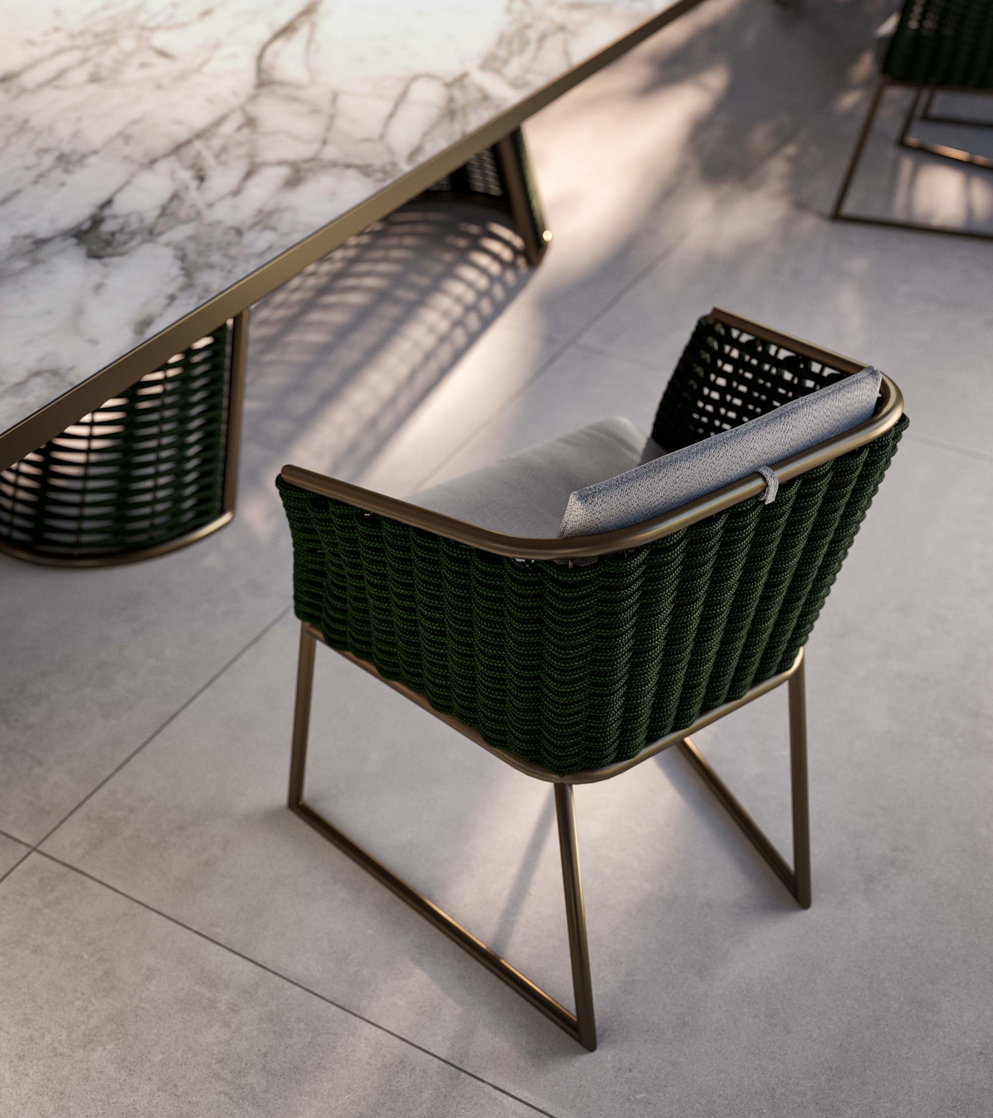 The Aphrodite chair reinterprets Rugiano’s outdoor language with a compact, contemporary design designed to harmonize with sophisticated yet functional environments.
