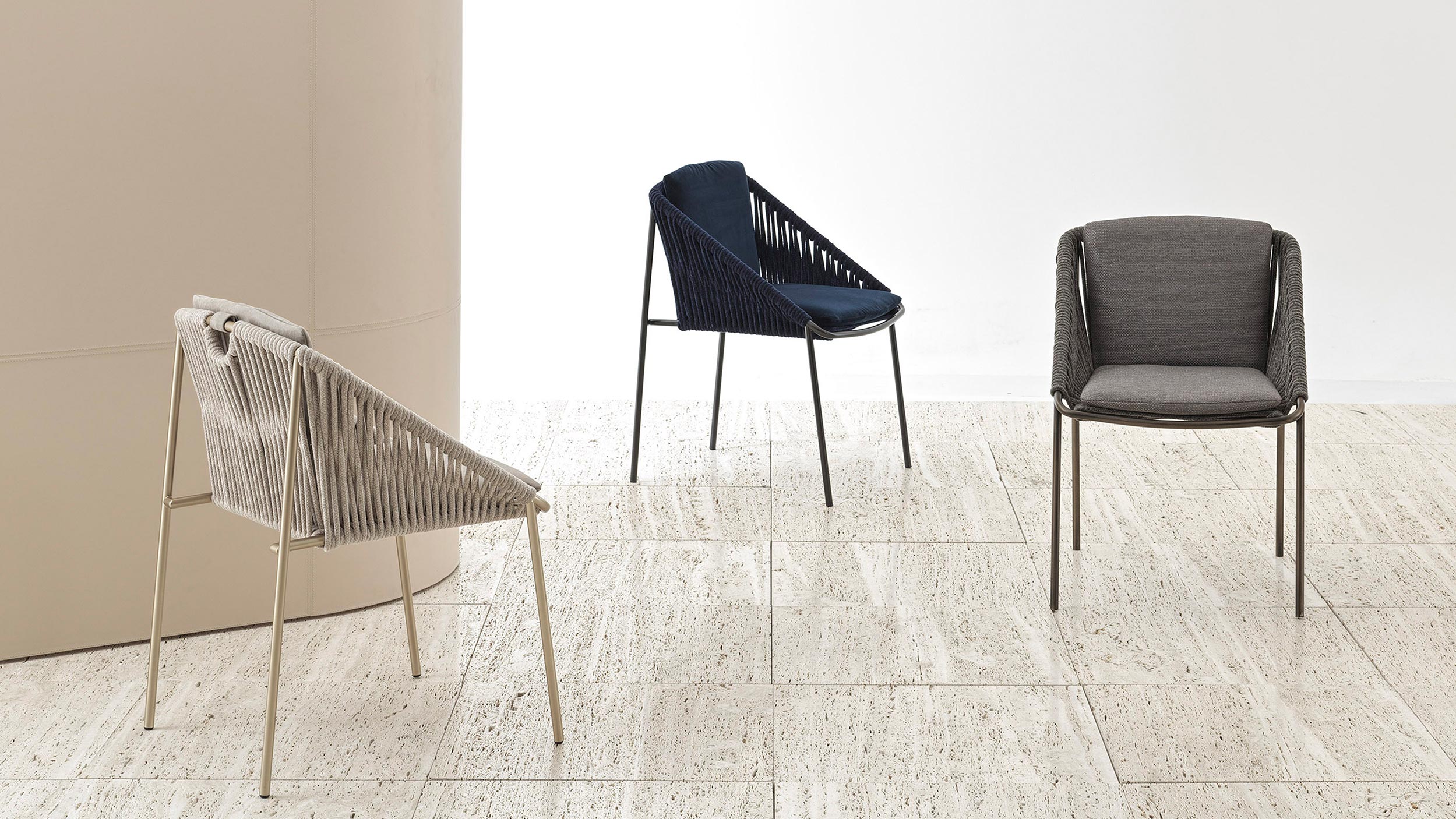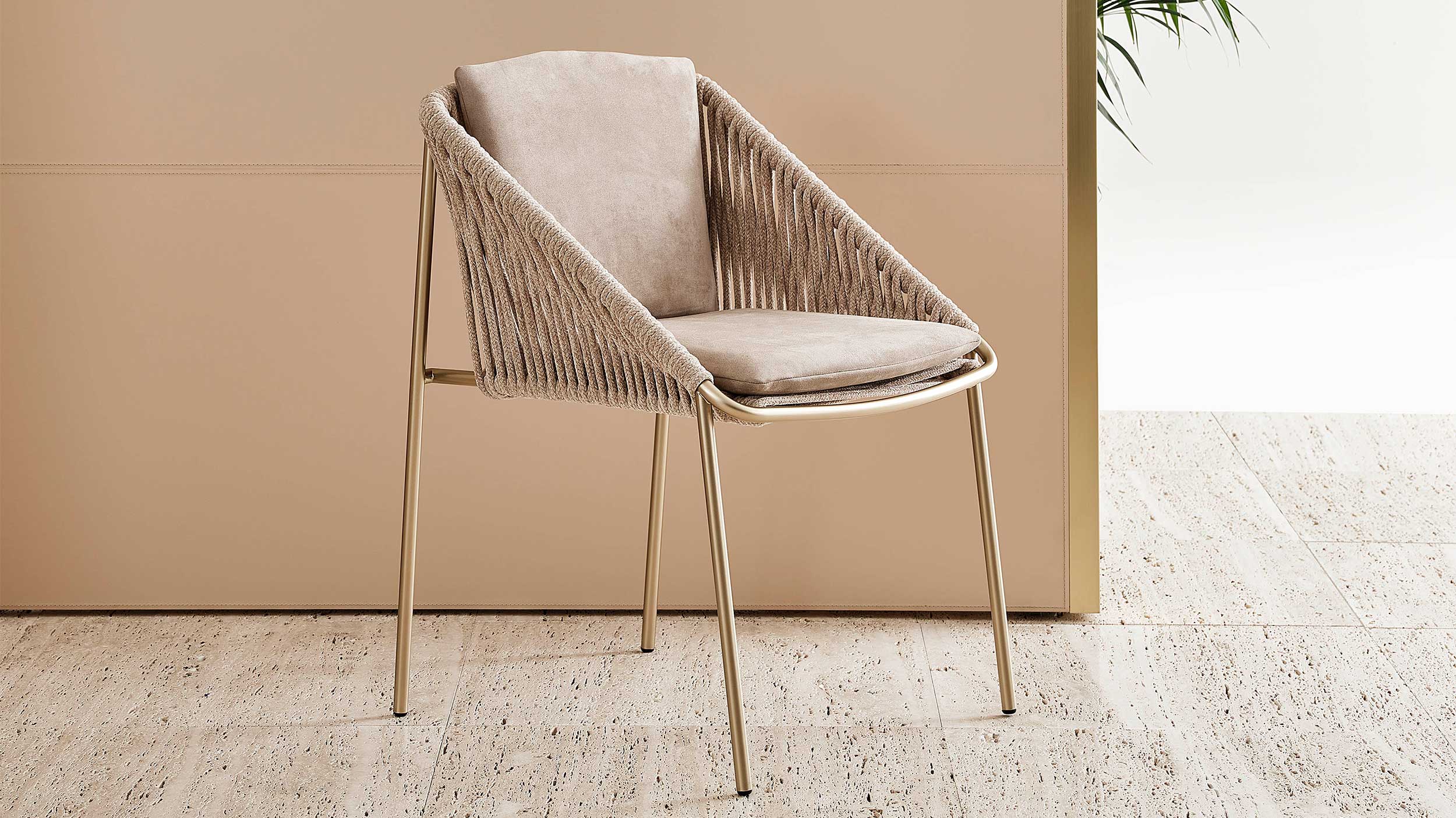Demetra In Collection of seating with distinctive velvet rope details. Comfortable seat and back cushions. Chair, bench and stool available. Client: Lorem Category: Chair Date: 28 August 2025 Tags: Diningroom