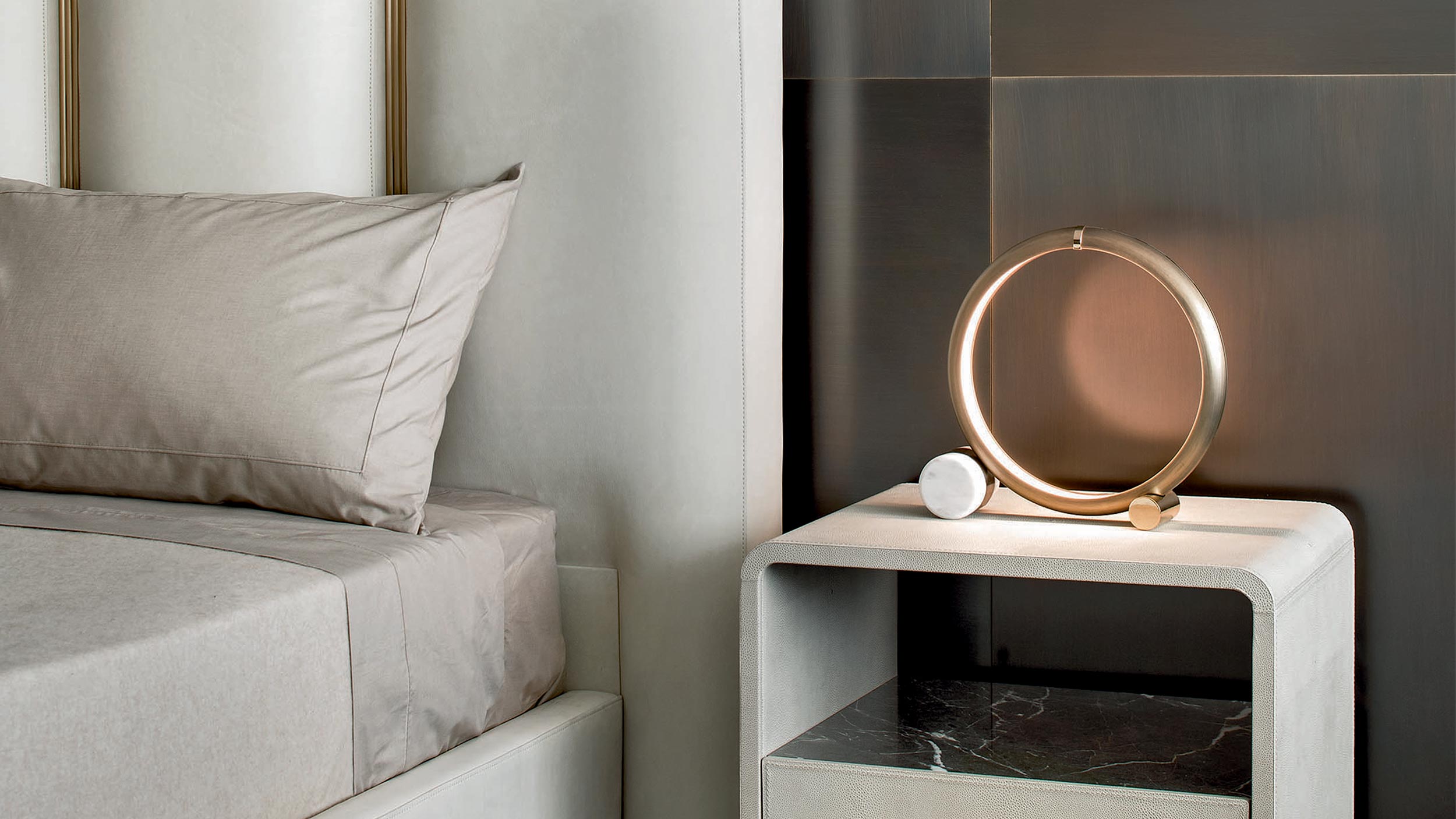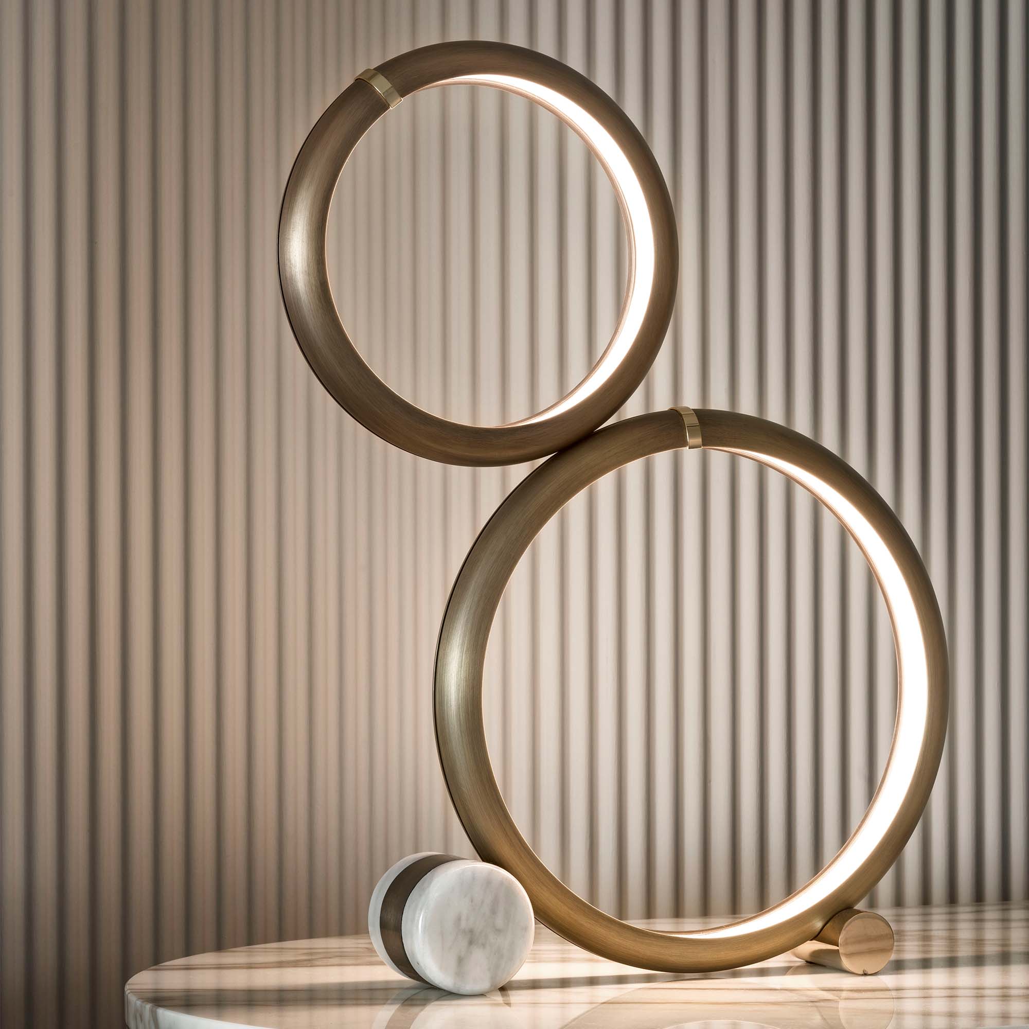 Halo Collection of bronze lamps with polished brass details, from pendant to table lamp. The rings are used individually or in harmonious compositions. Client: Lorem Category: Lighting Date: 28 August 2025 Tags: Lighting