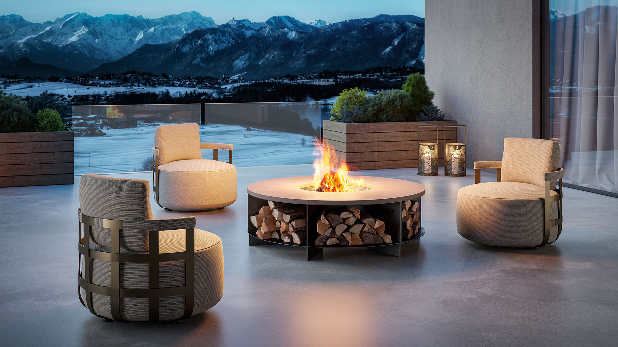 The outdoor bronze metal frame features a perforated geometric pattern that draws plays of light and shadow, while the upper handle is hand-corded, in continuity with the material language of Rugiano’s collections. The model is available with a removable lid equipped with integrated light, touch ignition and warm light intensity adjustment, or in an open version for use with a candle.