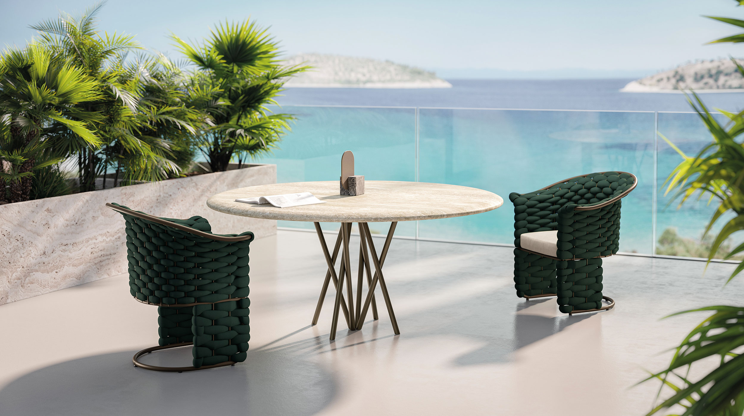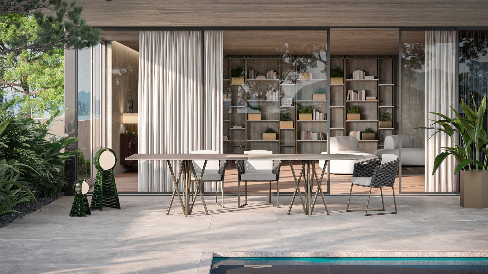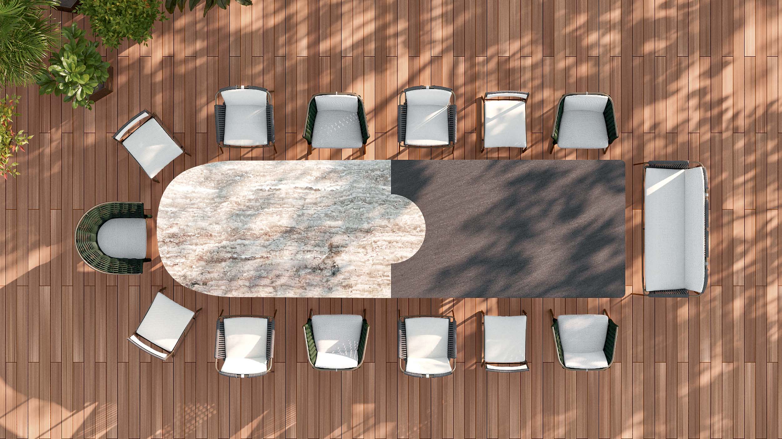 Designed to withstand outdoor conditions without sacrificing sophistication, Mikado is the ideal table for those seeking a contemporary design element capable of dialoguing with the architecture of the space and the nature that surrounds it.