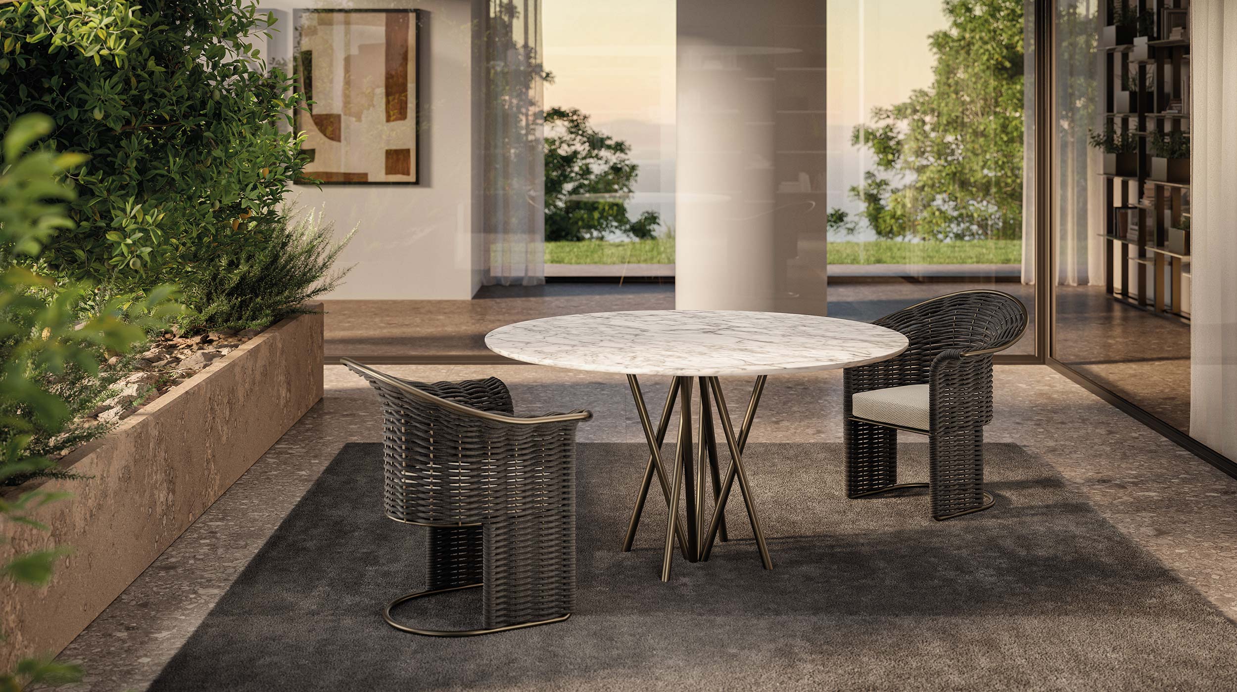 The outdoor bronze steel structure is composed of slender metal elements that cross each other in only apparent order, creating a dramatic and surprisingly light base. The top, available in natural stone, fits elegantly into the design below, completing a balanced composition, where the essentiality of the slab contrasts with the dynamism of the base.