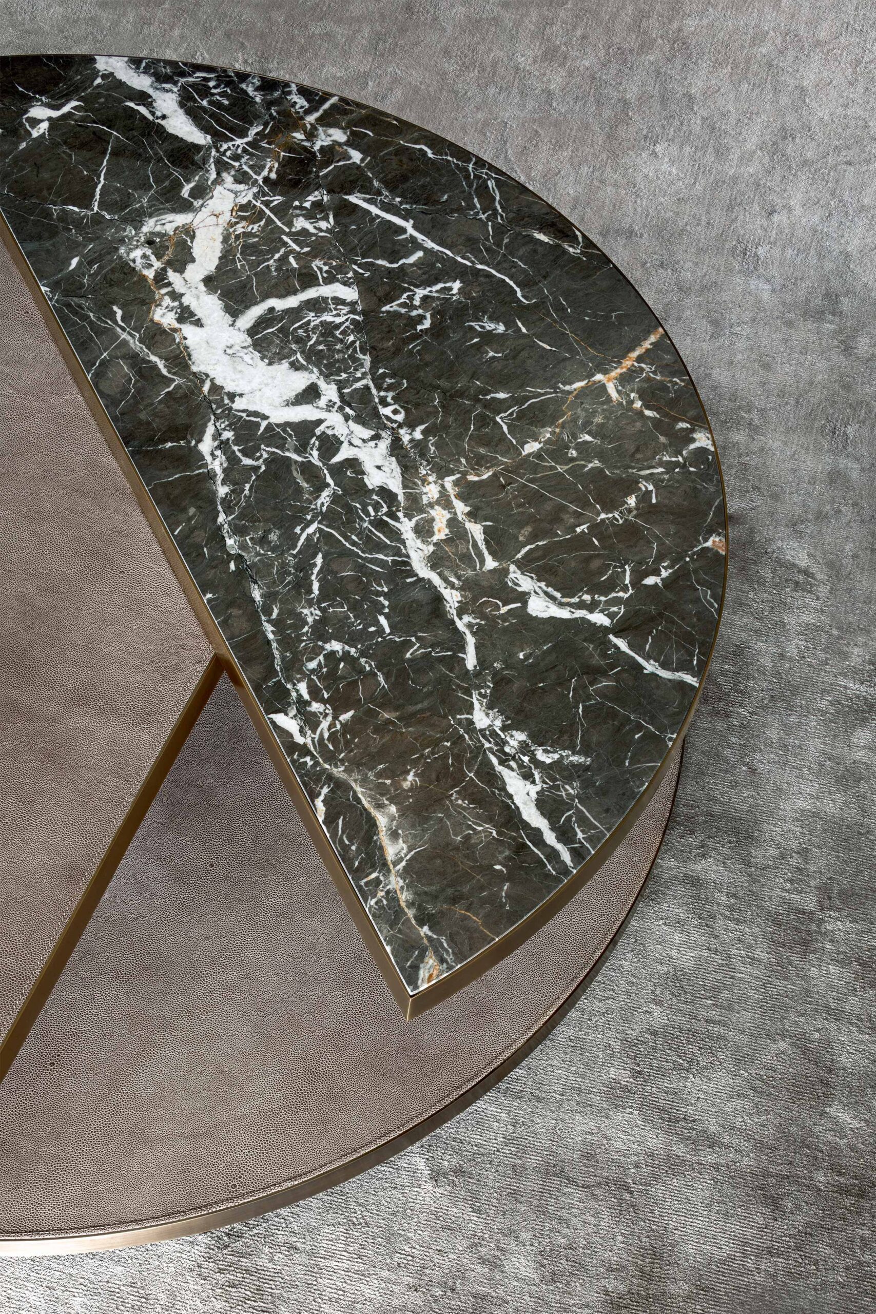 Round shape and different levels for the upper tops, all with bronze profiles, available in leather and marble or ebony and leather combination.