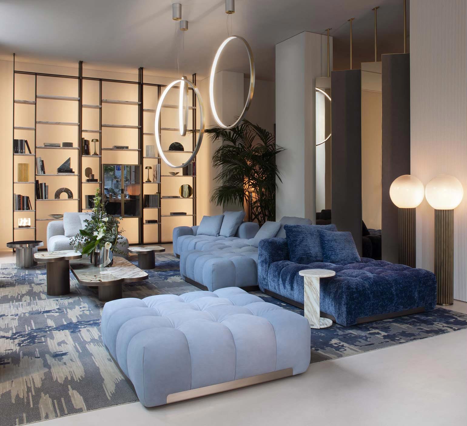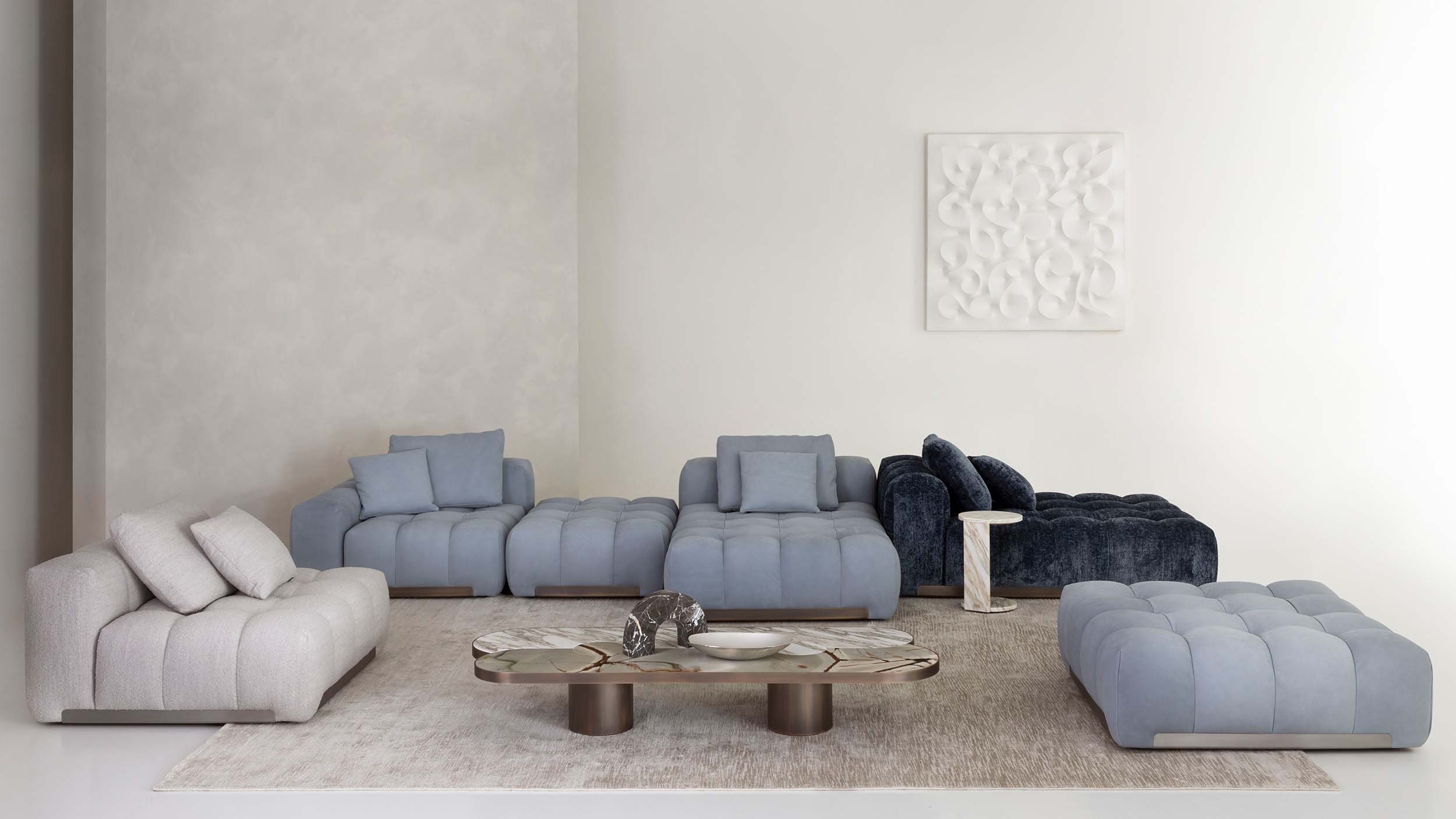 The Memphis upholstered furniture collection, features a linear metal base with extremely elegant lines and leather details for the leather-covered versions. The base with integrated marble side tables allows the creation of different compositions.